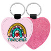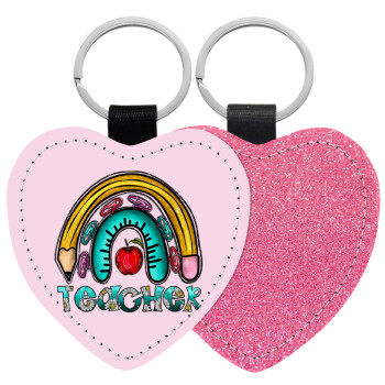 Teacher, Μπρελόκ PU δερμάτινο glitter καρδιά ΡΟΖ