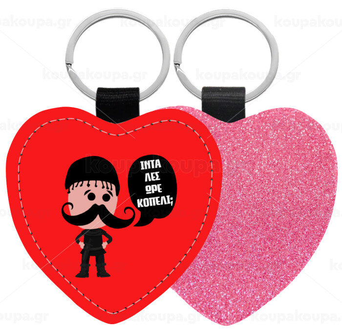 Κρητικός "Ίντα λες ωρέ κοπέλι", Μπρελόκ PU δερμάτινο glitter καρδιά ΡΟΖ
