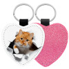 Cat cracked, Μπρελόκ PU δερμάτινο glitter καρδιά ΡΟΖ