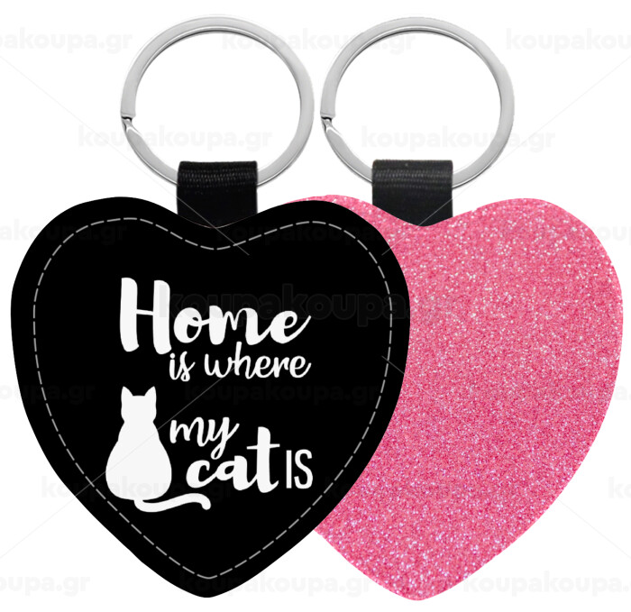Home is where my cat is!, Μπρελόκ PU δερμάτινο glitter καρδιά ΡΟΖ