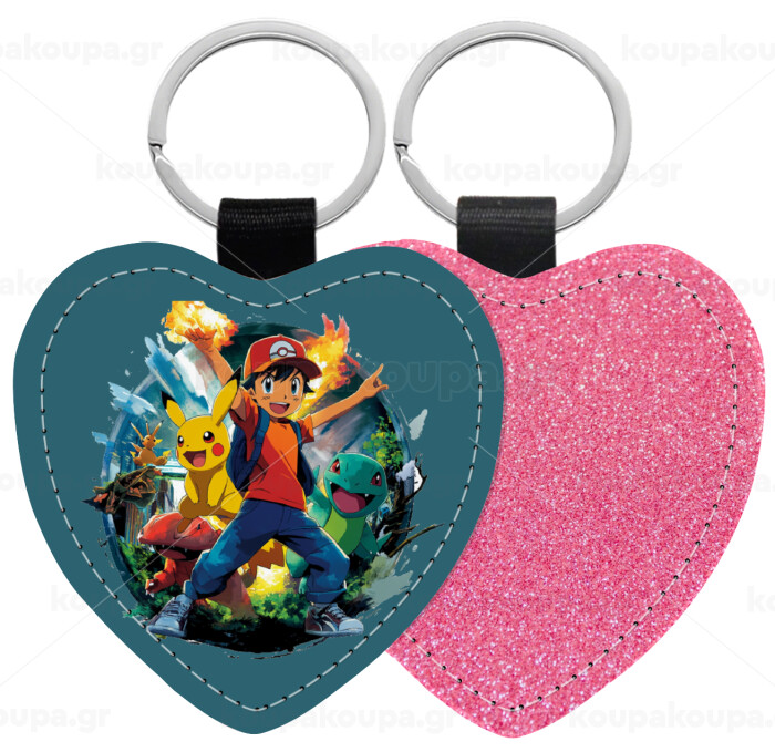 Ash Ketchum & Pikachu, Μπρελόκ PU δερμάτινο glitter καρδιά ΡΟΖ