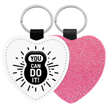 You can do it, Μπρελόκ PU δερμάτινο glitter καρδιά ΡΟΖ