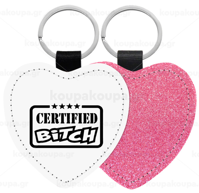Certified Bitch, Μπρελόκ PU δερμάτινο glitter καρδιά ΡΟΖ
