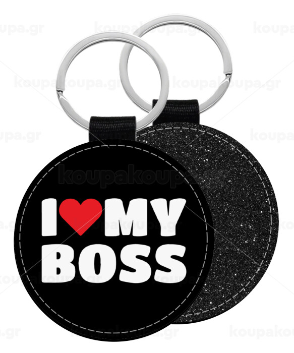 I LOVE MY BOSS, Μπρελόκ Δερματίνη, στρογγυλό ΜΑΥΡΟ (5cm)