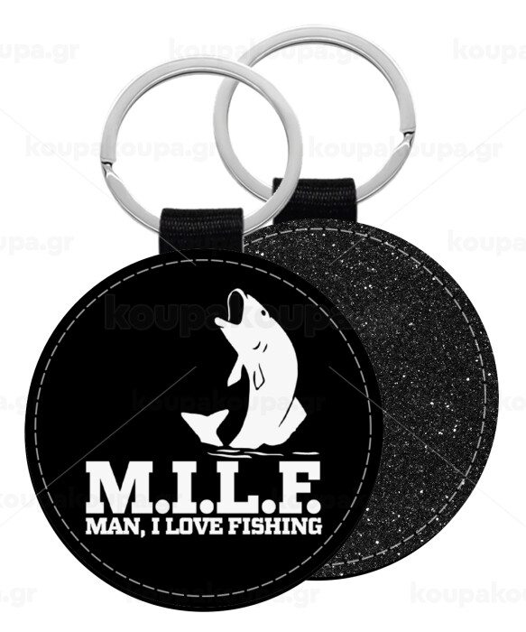 M.I.L.F. Mam i love fishing, Μπρελόκ Δερματίνη, στρογγυλό ΜΑΥΡΟ (5cm)