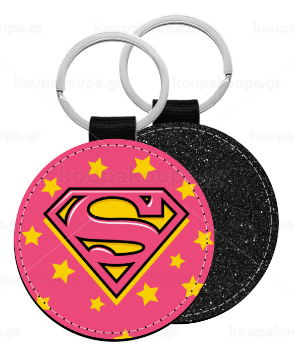 Superman Pink, Μπρελόκ Δερματίνη, στρογγυλό ΜΑΥΡΟ (5cm)