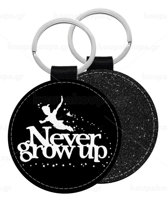Peter pan, Never Grow UP, Μπρελόκ Δερματίνη, στρογγυλό ΜΑΥΡΟ (5cm)