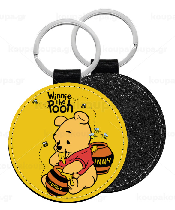 Winnie the Pooh, Μπρελόκ Δερματίνη, στρογγυλό ΜΑΥΡΟ (5cm)