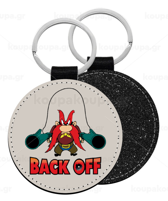 Yosemite Sam Back OFF, Μπρελόκ Δερματίνη, στρογγυλό ΜΑΥΡΟ (5cm)