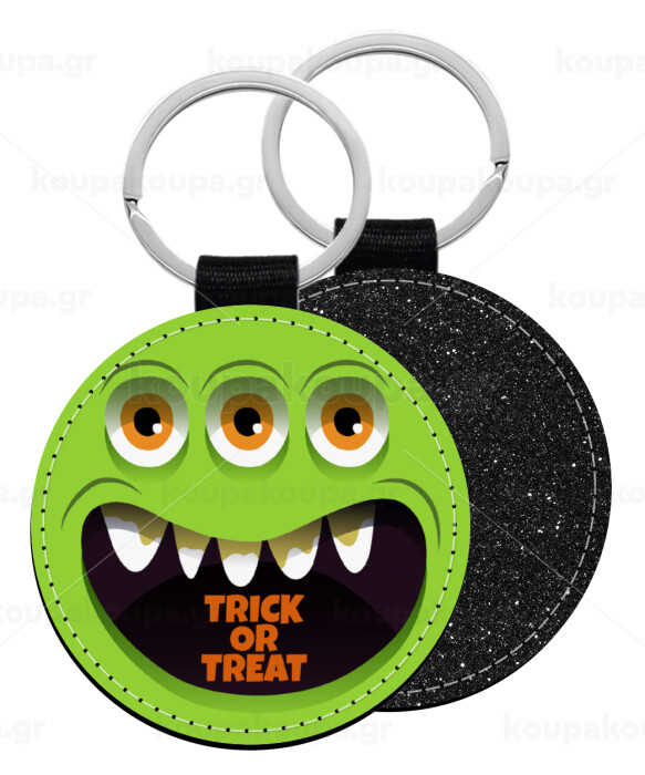Halloween trick or treat 3 eyes monster, Μπρελόκ Δερματίνη, στρογγυλό ΜΑΥΡΟ (5cm)