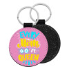 Leatherette keychain with glitter on one side and high resistance leatherette on the other. Safety ring for the keys.