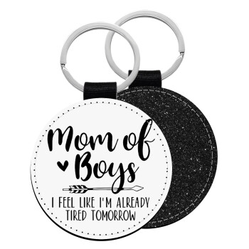 Mom of boys i feel like im already tired tomorrow, Μπρελόκ Δερματίνη, στρογγυλό ΜΑΥΡΟ (5cm)