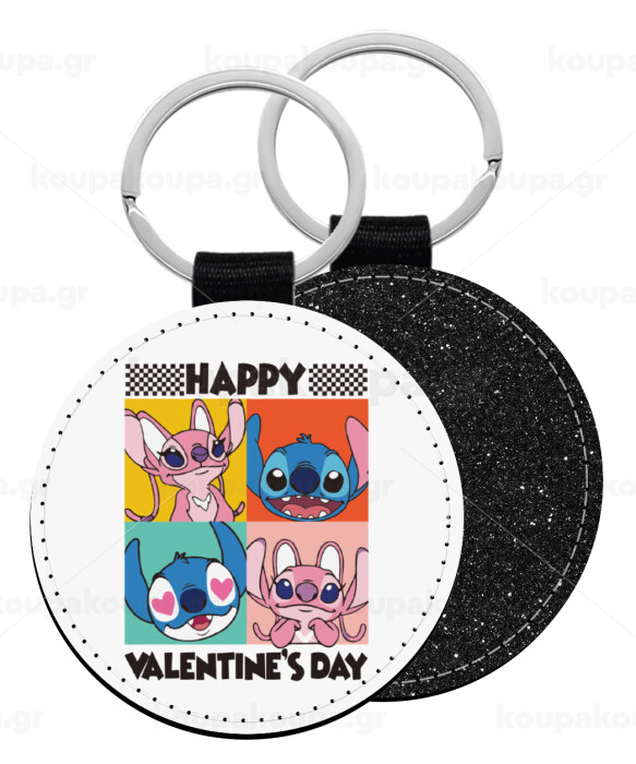Lilo & Stitch Happy valentines day, Μπρελόκ Δερματίνη, στρογγυλό ΜΑΥΡΟ (5cm)