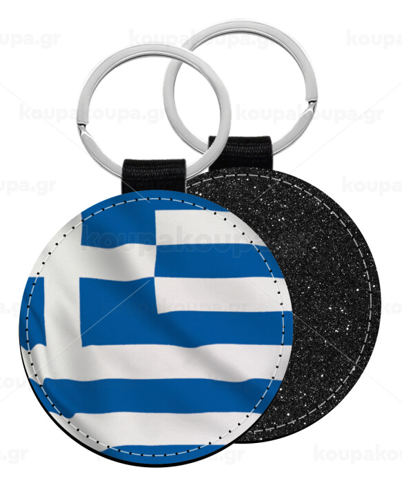 GREEK Flag, Μπρελόκ Δερματίνη, στρογγυλό ΜΑΥΡΟ (5cm)