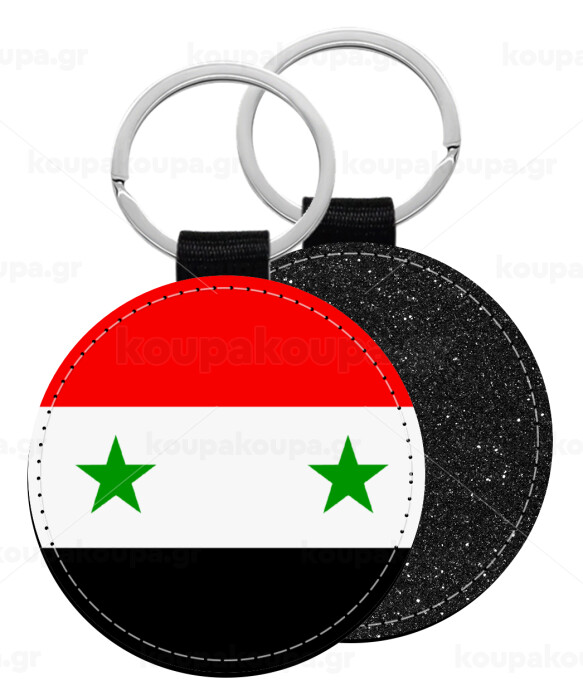 Syria flag, Μπρελόκ Δερματίνη, στρογγυλό ΜΑΥΡΟ (5cm)