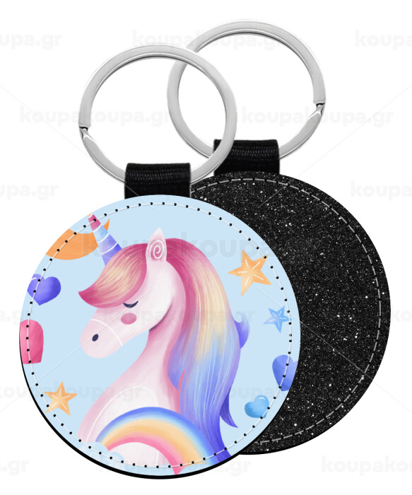 Cute unicorn, Μπρελόκ Δερματίνη, στρογγυλό ΜΑΥΡΟ (5cm)