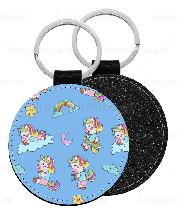 Unicorn pattern, Μπρελόκ Δερματίνη, στρογγυλό ΜΑΥΡΟ (5cm)