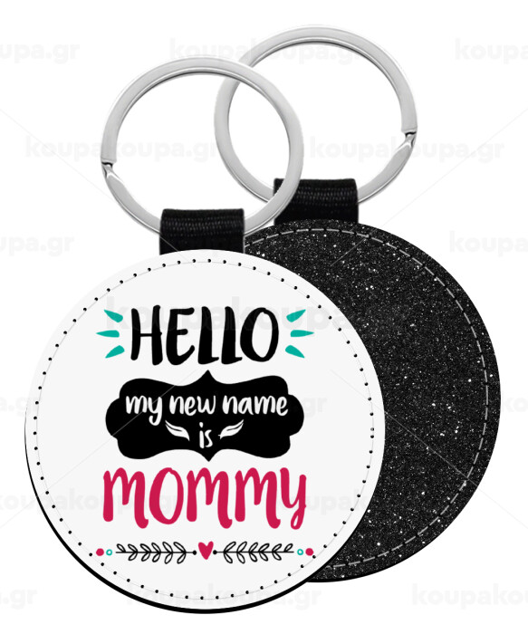 Hello, my new name is Mommy, Μπρελόκ Δερματίνη, στρογγυλό ΜΑΥΡΟ (5cm)