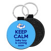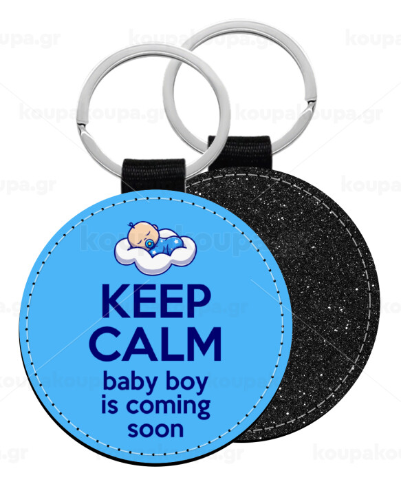 KEEP CALM baby boy is coming soon!!!, Μπρελόκ Δερματίνη, στρογγυλό ΜΑΥΡΟ (5cm)