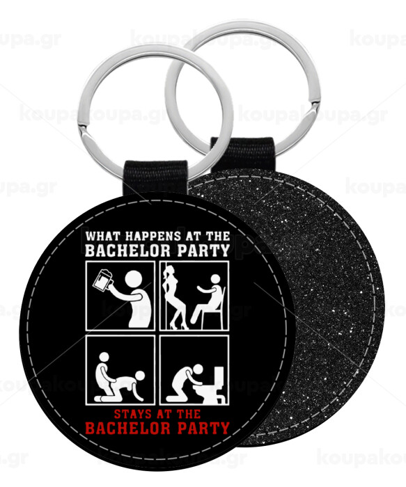 What happens at the bachelor party, stays at the bachelor party!, Μπρελόκ Δερματίνη, στρογγυλό ΜΑΥΡΟ (5cm)
