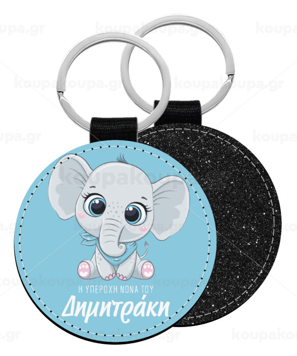 Η νονά μου, ελεφαντάκι γαλάζιο, Μπρελόκ Δερματίνη, στρογγυλό ΜΑΥΡΟ (5cm)