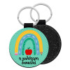 Leatherette keychain with glitter on one side and high resistance leatherette on the other. Safety ring for the keys.