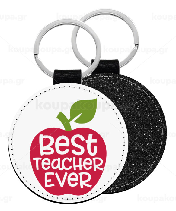 best teacher ever, apple!, Μπρελόκ Δερματίνη, στρογγυλό ΜΑΥΡΟ (5cm)
