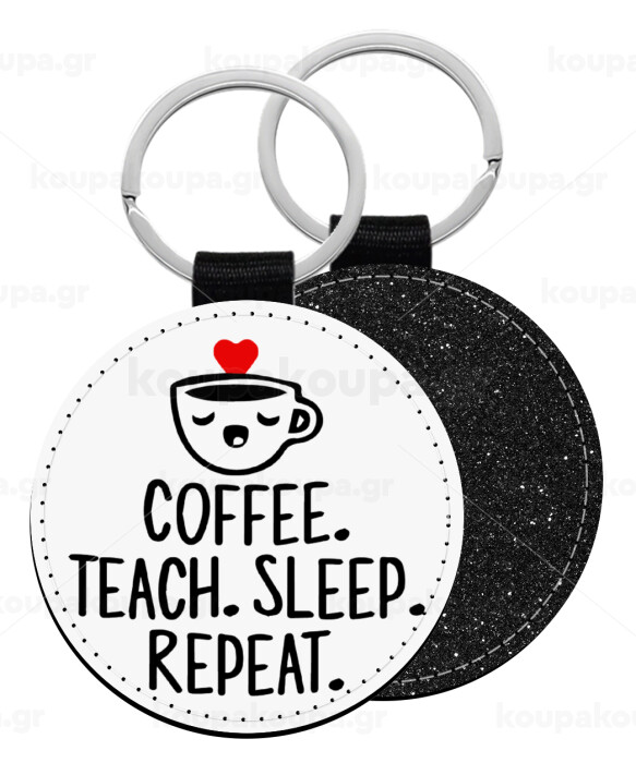 Coffee Teach Sleep Repeat, Μπρελόκ Δερματίνη, στρογγυλό ΜΑΥΡΟ (5cm)