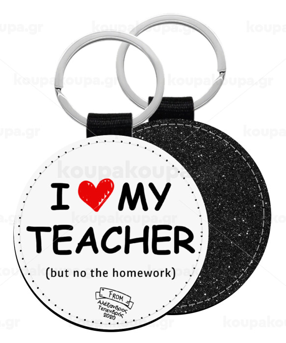 i love my teacher but no the homework, Μπρελόκ Δερματίνη, στρογγυλό ΜΑΥΡΟ (5cm)