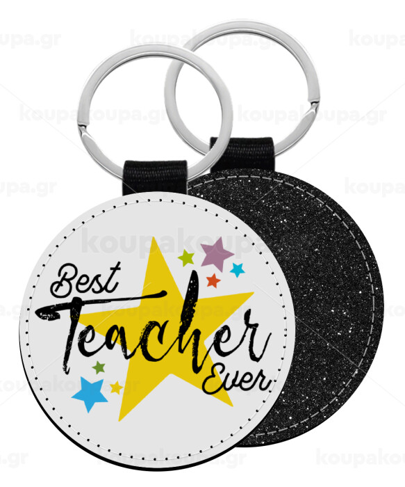 Teacher super star!!!, Μπρελόκ Δερματίνη, στρογγυλό ΜΑΥΡΟ (5cm)