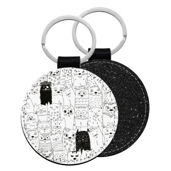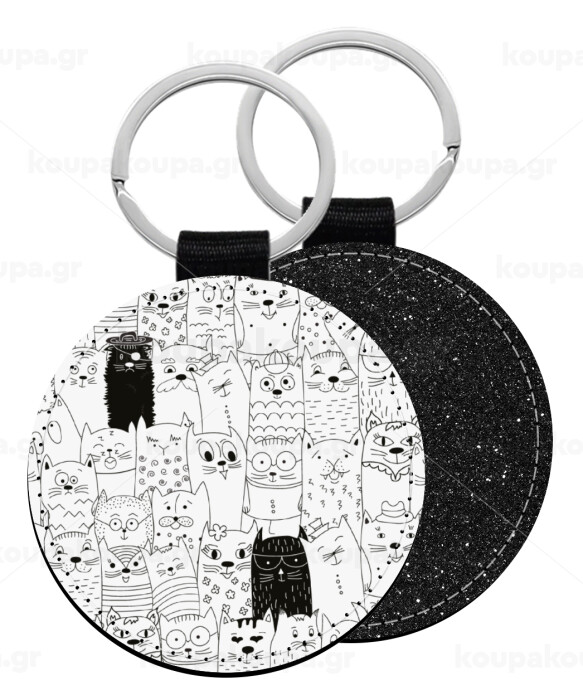 Γάτες γραμμικό σχέδιο, Μπρελόκ Δερματίνη, στρογγυλό ΜΑΥΡΟ (5cm)