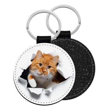 Cat cracked, Μπρελόκ Δερματίνη, στρογγυλό ΜΑΥΡΟ (5cm)
