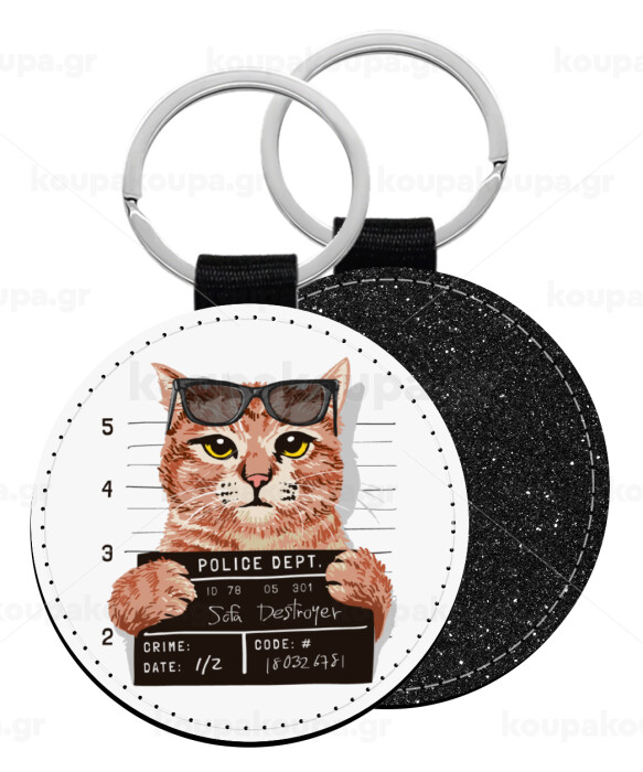 Cool cat, Μπρελόκ Δερματίνη, στρογγυλό ΜΑΥΡΟ (5cm)