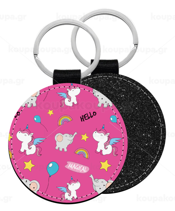 Leatherette keychain with glitter on one side and high resistance leatherette on the other. Safety ring for the keys.