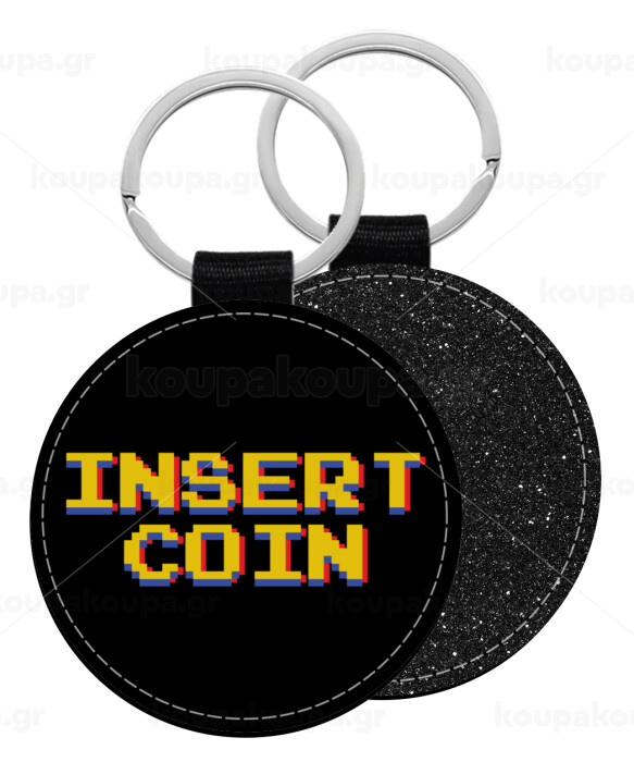 Insert coin!!!, Μπρελόκ Δερματίνη, στρογγυλό ΜΑΥΡΟ (5cm)
