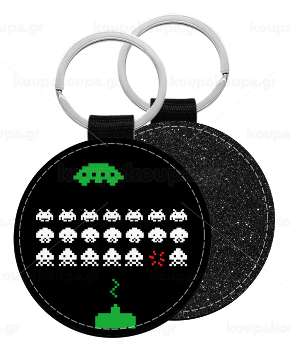 Space invaders, Μπρελόκ Δερματίνη, στρογγυλό ΜΑΥΡΟ (5cm)