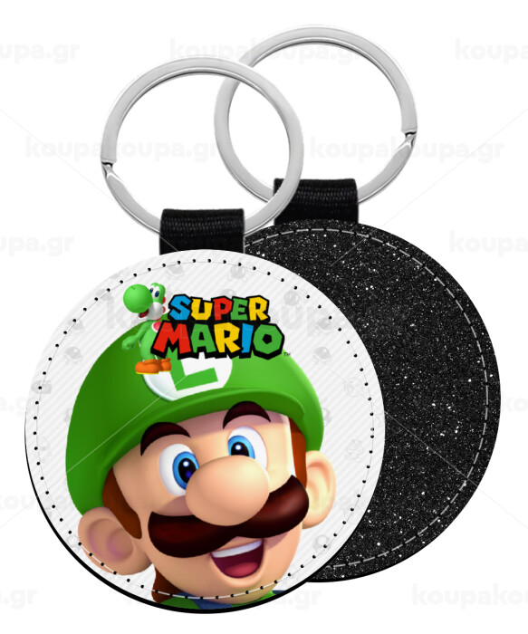 Super mario Luigi, Μπρελόκ Δερματίνη, στρογγυλό ΜΑΥΡΟ (5cm)