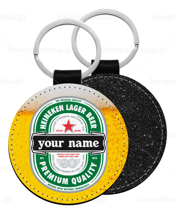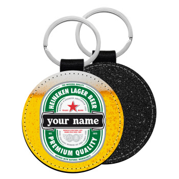 Heineken with name, Μπρελόκ Δερματίνη, στρογγυλό ΜΑΥΡΟ (5cm)