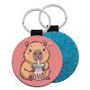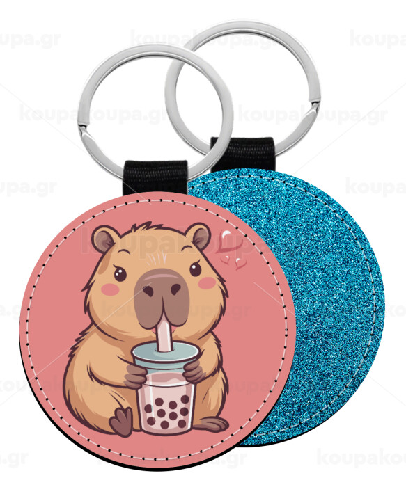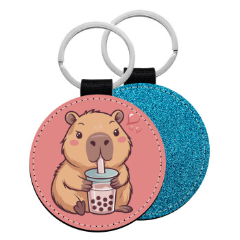 Capybara Bubble Tea, Μπρελόκ Δερματίνη, στρογγυλό ΜΠΛΕ (5cm)