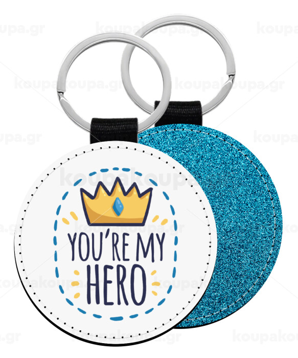 Dad, you are my hero!, Μπρελόκ Δερματίνη, στρογγυλό ΜΠΛΕ (5cm)