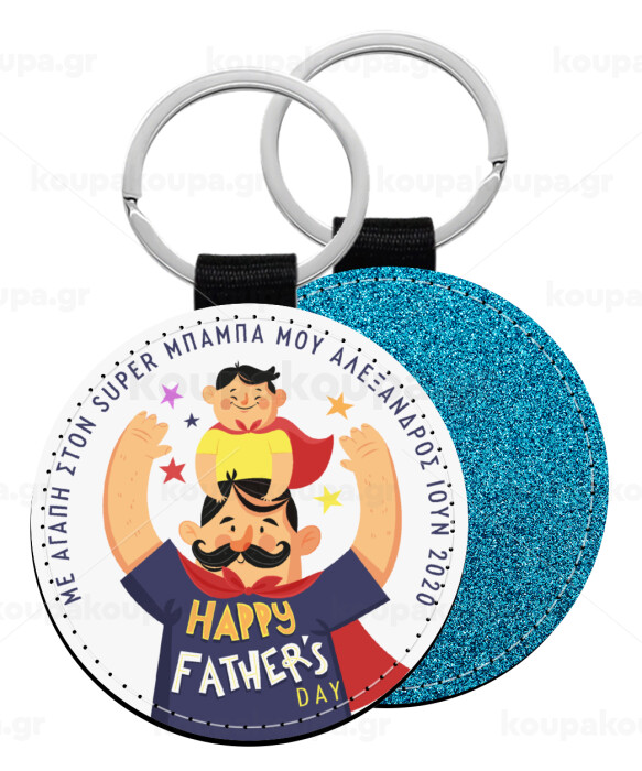 Happy Fathers Day με όνομα, Μπρελόκ Δερματίνη, στρογγυλό ΜΠΛΕ (5cm)