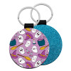 Leatherette keychain with glitter on one side and high resistance leatherette on the other. Safety ring for the keys.