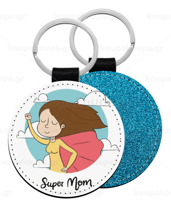 Super mom, Μπρελόκ Δερματίνη, στρογγυλό ΜΠΛΕ (5cm)
