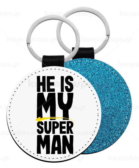 He is my superman, Μπρελόκ Δερματίνη, στρογγυλό ΜΠΛΕ (5cm)