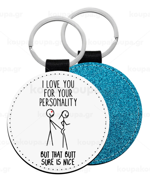 I Love you for your personality, Μπρελόκ Δερματίνη, στρογγυλό ΜΠΛΕ (5cm)