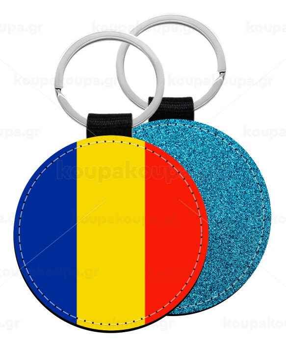 Romania flag, Μπρελόκ Δερματίνη, στρογγυλό ΜΠΛΕ (5cm)