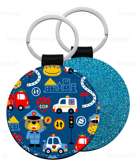 Rescue team cartoon, Μπρελόκ Δερματίνη, στρογγυλό ΜΠΛΕ (5cm)