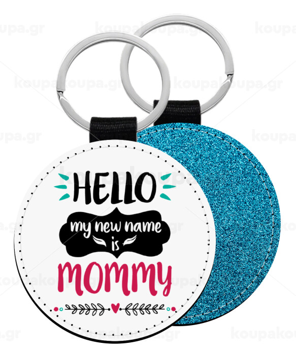 Hello, my new name is Mommy, Μπρελόκ Δερματίνη, στρογγυλό ΜΠΛΕ (5cm)