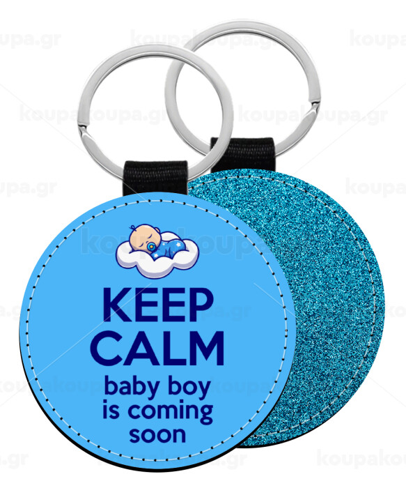 KEEP CALM baby boy is coming soon!!!, Μπρελόκ Δερματίνη, στρογγυλό ΜΠΛΕ (5cm)