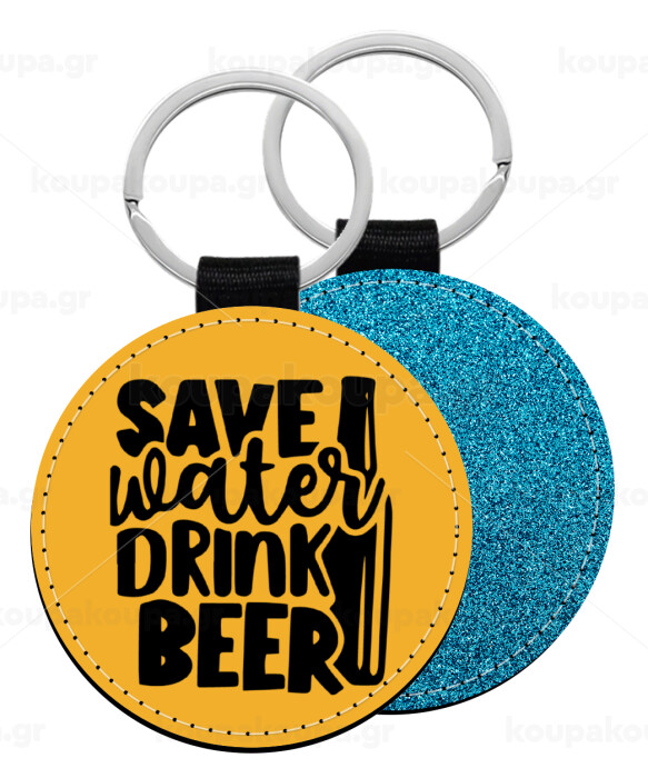 Save Water, Drink BEER, Μπρελόκ Δερματίνη, στρογγυλό ΜΠΛΕ (5cm)